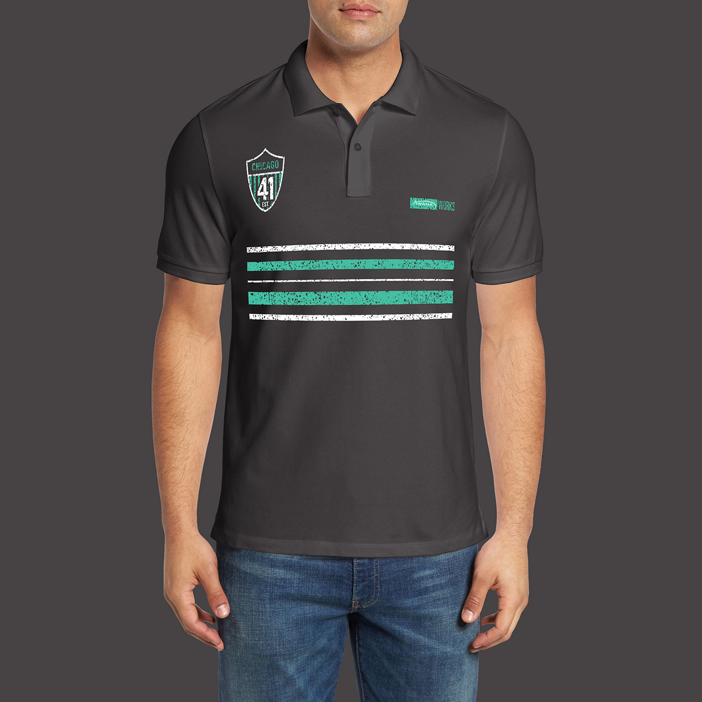 I designed this polo shirt for conference booth staff. Instead of only placing the company logo on the polo, I created a rugby-style design with stripes and a shield with the city and the year the company started.